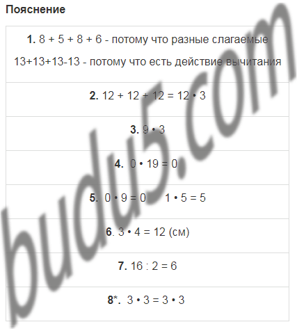 | 1. В каких выражениях сложение нельзя заменить умножением? | 4 + 4 + 4 13+13+13-13 8 + 5 + 8 + 6 |
