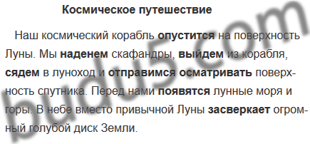 Наш космический корабль опустился на поверхность Луны. Мы надели скафандры, вышли из корабля, сели в луноход и отправились осматривать поверхность спутника. Перед нами появились лунные моря и горы. В небе вместо привычной Луны засверкал огромный голубой диск Земли.