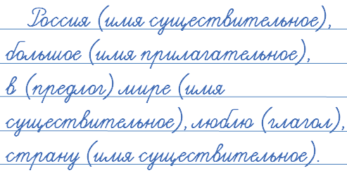 Россия (существительное), большое (прилагательное), в (предлог) мире (существительное), люблю (глагол), страну (существительное).