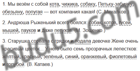 1. Мы везём с собой кота_ чижика_ собаку_ Петьку-забияку_ обезьяну_ попугая — вот компания какая! (С. Михалков.) 2. Андрюша Рыженький всего боялся: со-бак_ котов_ гусей_ мышей_ пауков_ и даже петухов. (М. Зощенко.) 3. Старушка сорвала с грядки_ и подала девочке Жене очень красивый цветок... У него было семь прозрачных лепестков: жёлтый_ красный_ зелёный_ синий_ оранжевый_ фиолетовый_ и голубой. (В. Катаев.)