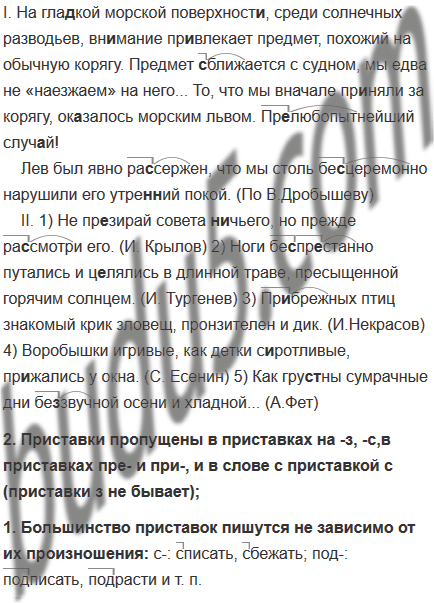 II. 1) Не пр..зирай совета (н..) чьего, но прежде ра(с, сс)мотри его. (И. Крылов) 2) Ноги бе(с, з)пр..станно путались и ц..клялись в длинной траве, пр..сыщенной горячим солнцем. (И. Тургенев) 3) Пр..брежных птиц знакомый крик зловещ, пронзителен и дик. (И. Некрасов) 4) Воробышки игривые, как детки с..ротливые, пр..жались у окна. (С. Есенин) 5) Как гру(с, ст)ны сумрачные дни бе(з, зз)вучной осени и хладной... (А.Фет)
