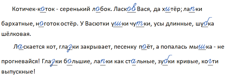 Котичек-к_ток - серенький л_бок. Ласк_ Вася, да х_тёр; ла_ки бархатные, н_готок остёр. У Васютки у_ки чу_ки, усы длинные, шу_ка шёлковая.