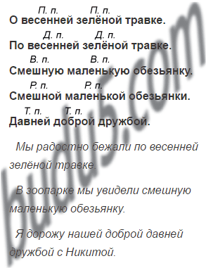 | Весенняя зелёная травка | ед. ч. ед. ч. | П. п. Д. п. |