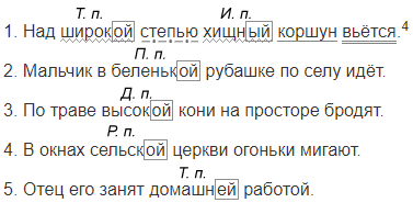 1. Над (широкая степь) хищный коршун вьётся.4 2. Мальчик в (беленькая рубашка) по селу идёт. 3. По (трава высокая) кони на просторе бродят. 4. В окнах (сельская церковь) огоньки мигают. 5. Отец его занят (работа домашняя).