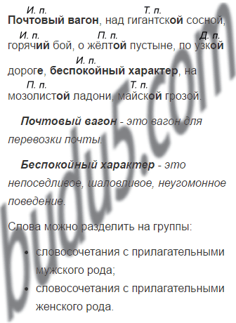 Все словосочетания можно объединить в две группы. Первая группа - словосочетания с прилагательными и существительными мужского рода; вторая - словосочетания с прилагательными и существительными женского рода.