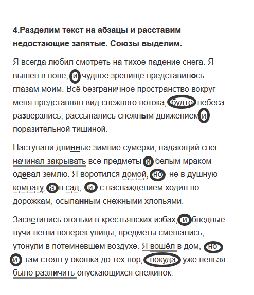 Я вышел в поле и чудное зрелище представил..сь глазам моим. Всё безграничное пространство (во)круг меня представлял вид снежного потока будто небеса ра..верзлись рассыпались снежн..м движением и поразительной тишиной. Наступали дли(н, нн)ые зимние сумерки; падающий снег начинал закрывать все предметы и белым мраком од..вал землю. Я воротился домой но не в душную комнату, а в сад и с наслаждением ходил по доро..кам, осыпа(н, нп)ым снежными хлопьями. Засветились огоньки в крестьянских избах и бледные лучи легли поперёк улицы; предметы смешались утонули в потемневшем воздухе. Я вош..л в дом но и там стоял у окошка до тех пор, покуда уже нельзя было различить опускающихся снежинок.