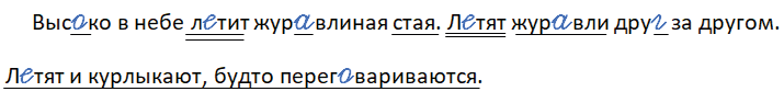 высоко (высо́кий), летит (полё́т), журавлиная (жура́вль), переговариваются (го́вор) - безударная гласная