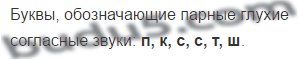 Парные глухие согласные звуки это: [п], [п’], [ф], [ф’], [к], [к’], [т], [т’], [ш], [с], [с’].