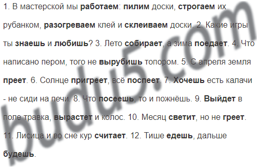 1. В мастерской мы (работать): (пилить) доски, (строгать) их рубанком, (разогревать) клей и (склеивать) доски. 2. Какие игры ты (знать) и (любить)? 3. Лето (собирать), а зима (поедать). 4. Что написано пером, того не (вырубить) топором. 5. С апреля земля (преть). 6. Солнце (пригреть), всё (поспеть). 7. (Хотеть) есть калачи - не сиди на печи. 8. Что (посеять), то и пожнёшь. 9. (Выйти) в поле травка, (вырасти) и колос. 10. Месяц (светить), но не (греть). 11. Лисица и во сне кур (считать). 12. Тише (ехать), дальше (быть).